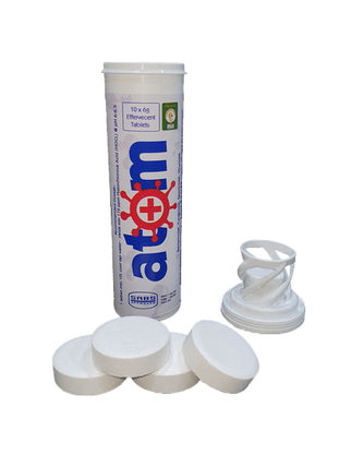 Atom Plus is a disinfectant based on Hypochlorous Acid, conveniently packed into an effervecent tablet for easy and accurate dispensing.